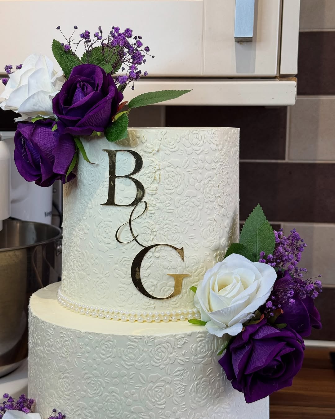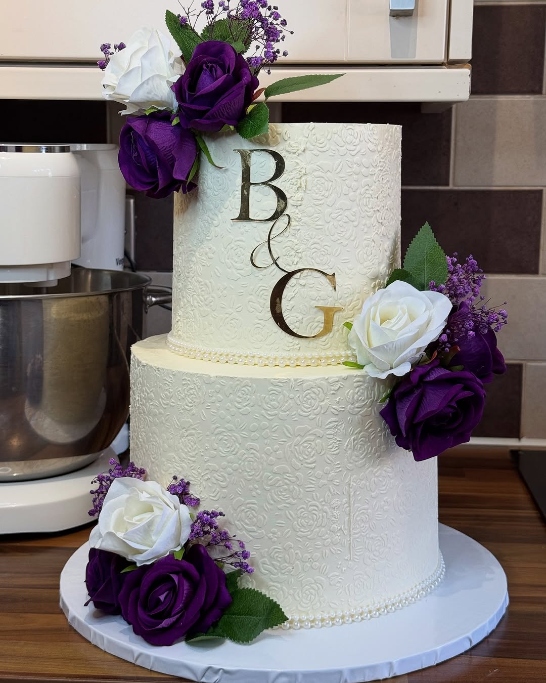 This breathtaking two-tier ivory cake is the pinnacle of wedding elegance. Each tier is meticulously decorated with a full-body floral embossing, creating a subtle yet deeply sophisticated lace-like texture across the entire surface. The cake is framed by delicate pearl borders and accented with cascading clusters of deep purple and ivory roses, paired with sprigs of purple baby’s breath. Topped with a custom gold monogram reflecting the couple’s initials, this cake serves as a romantic and stately centerpiece that perfectly complements a classic or floral-themed wedding.