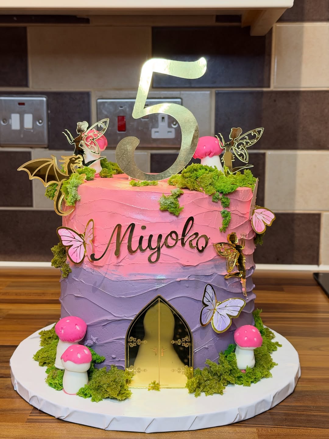 Step into a world of magic and wonder with this whimsical “Enchanted Forest” cake, specially designed for a very special 5th birthday. The cake features a beautiful two-tone textured frosting that transitions from a soft pink to a deep lilac. It is intricately decorated with edible moss, vibrant pink toadstools, and delicate butterflies that appear to be fluttering around the tiers. At the base sits a mysterious golden “secret garden” door, guarded by tiny fairies. This cake is designed to spark the imagination and bring a touch of fairytale magic to your child’s birthday party.