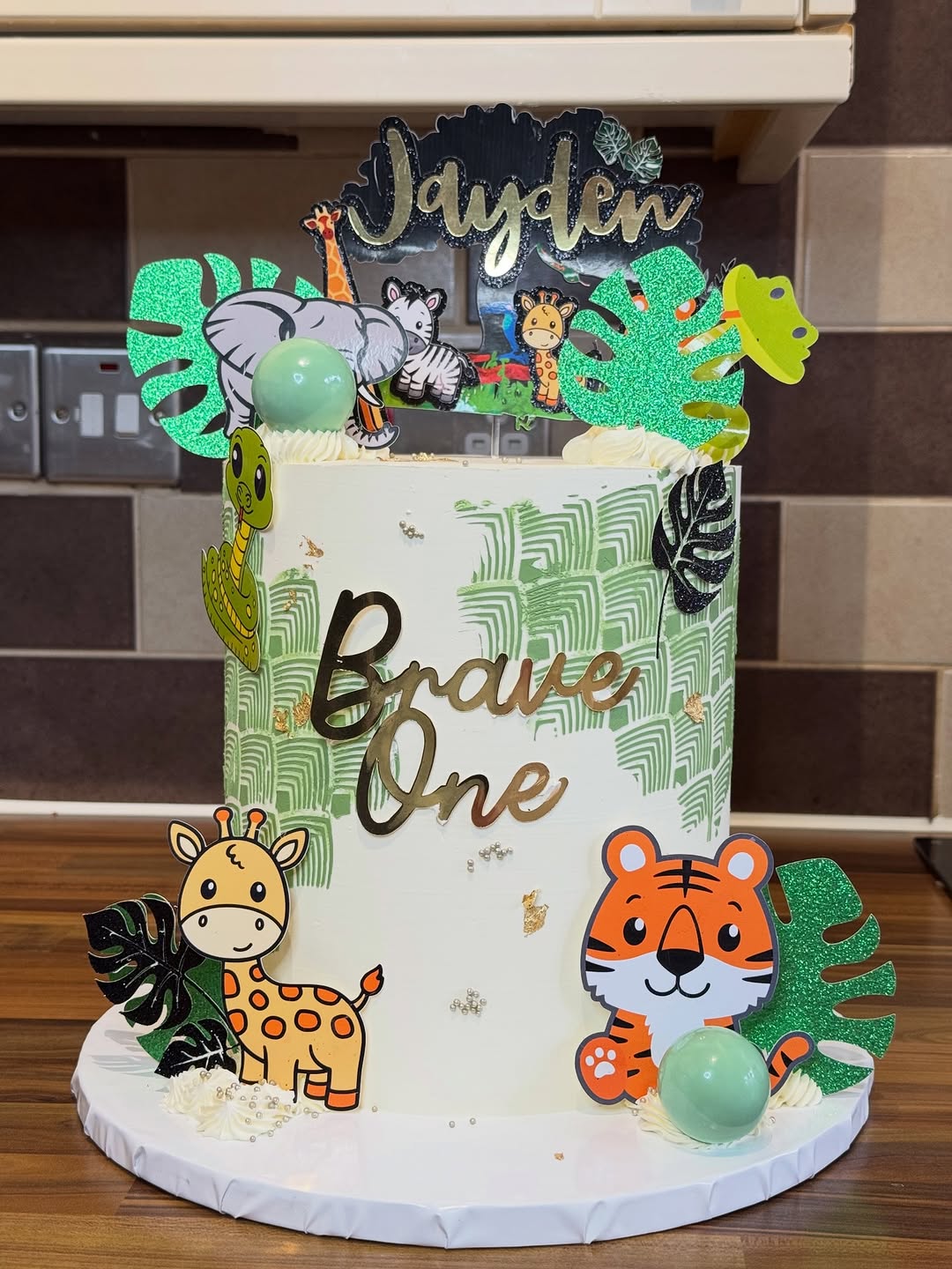 A fun and vibrant safari-themed cake decorated with green tropical leaf stencils, adorable animal characters, and a custom gold name charm for your little adventurer.