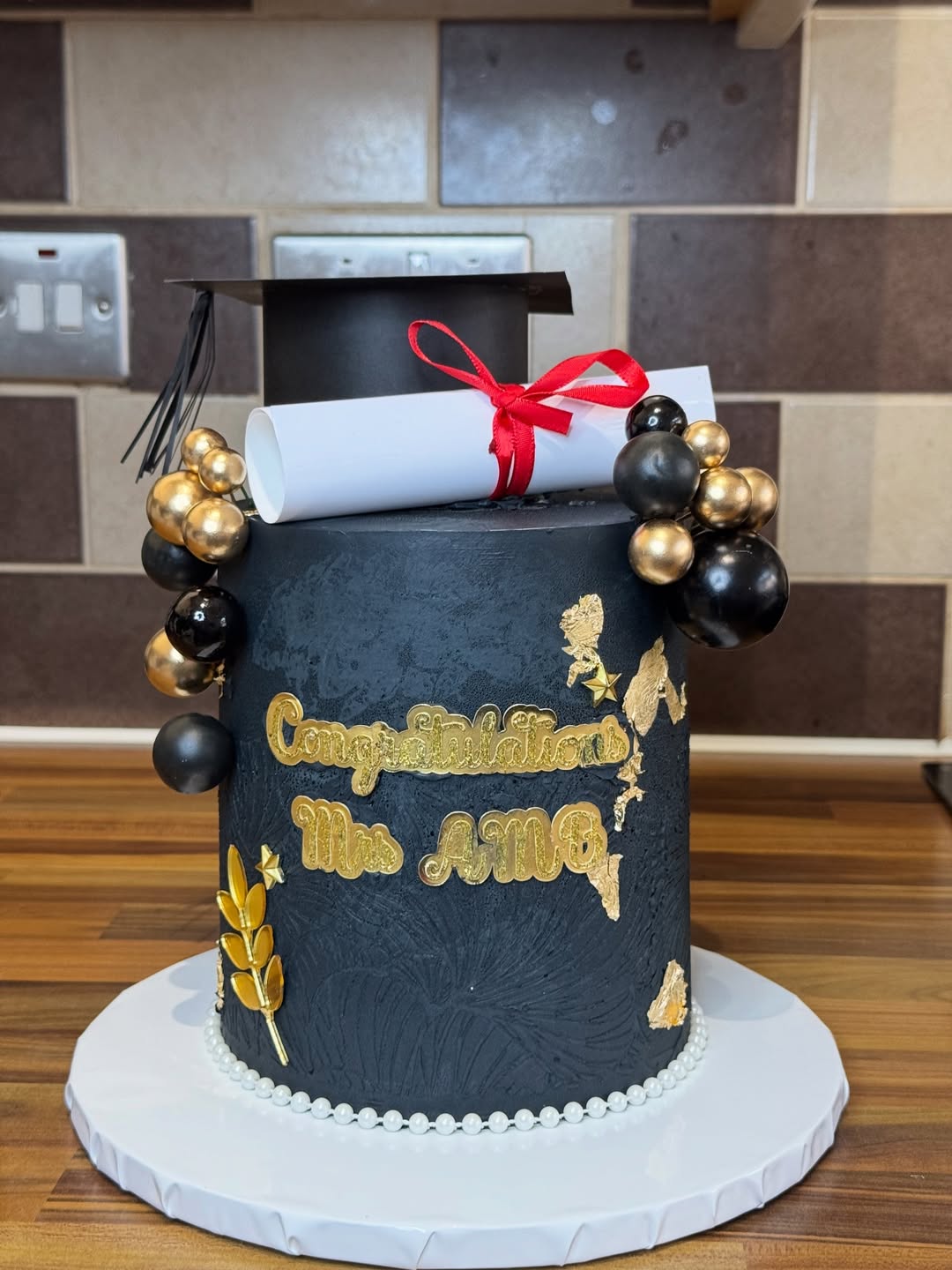 Mark a momentous academic achievement with this bold and sophisticated graduation cake. The cake features a dramatic, textured black buttercream finish that exudes modern luxury. It is meticulously detailed with genuine edible gold leaf, reflecting success and brilliance. The design is topped with a classic graduation mortarboard cap and a hand-rolled diploma scroll with a red ribbon. Accented with clusters of black and gold metallic spheres and a custom “Congratulations” gold charm, this cake is the ultimate tribute to a graduate’s hard work and dedication.