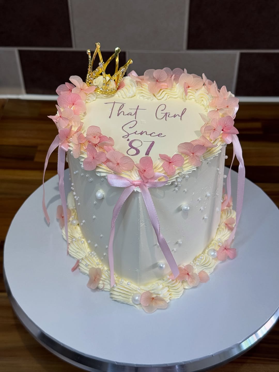 Capture the retro-chic trend with our stunning heart-shaped vintage cake. This design uses traditional “Lambeth” piping techniques to create layers of ornate, swirled buttercream borders. The cake is customized with elegant purple lettering that reads “That Girl Since ’87” (or any year of your choice), making it a personal and fashionable birthday statement. Adorned with delicate pink silk flowers, dainty ribbons, and shimmering edible pearls, this cake is the perfect blend of 90s nostalgia and modern luxury for the ultimate “Pinterest-worthy” celebration.